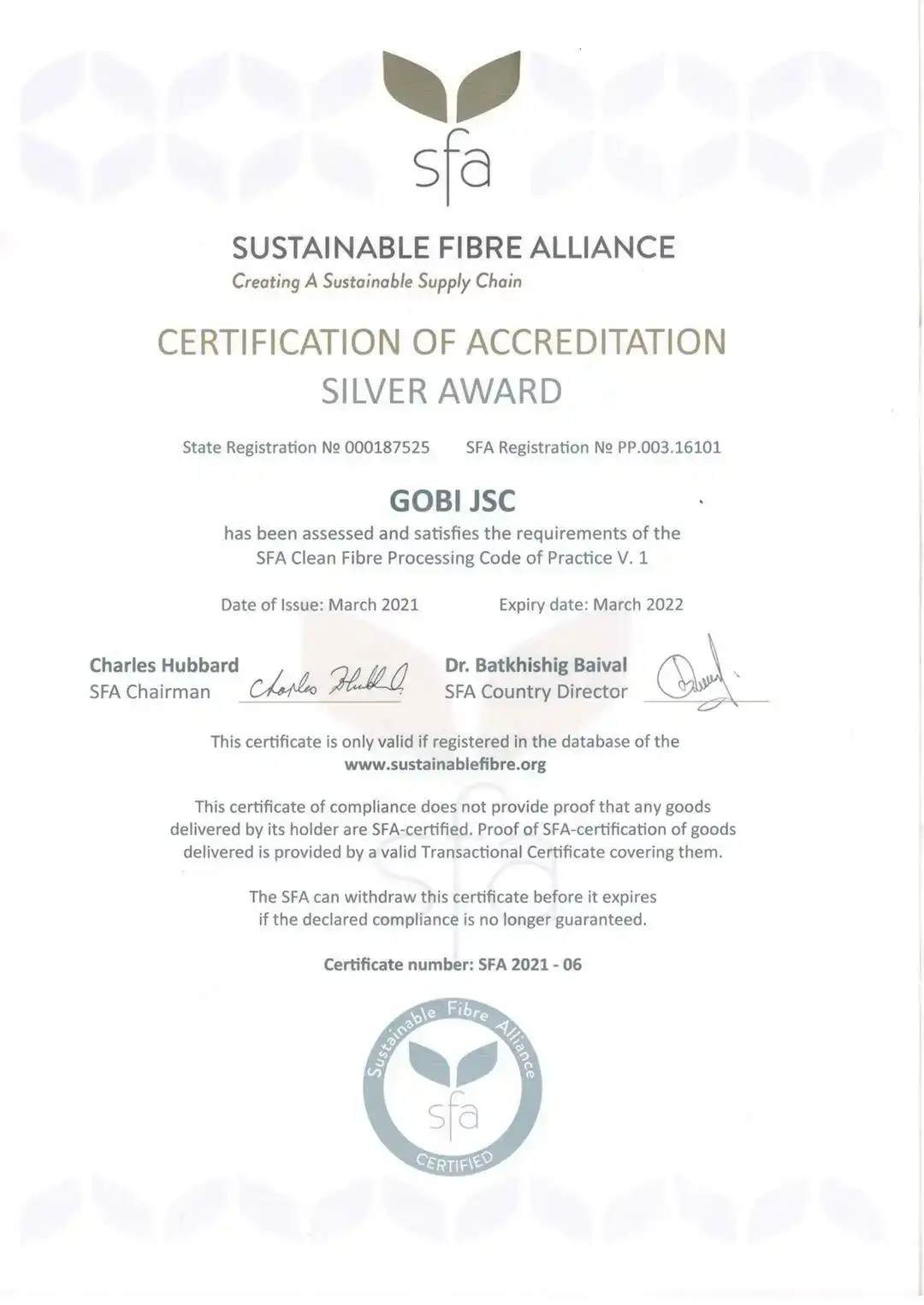On September 26, 2020, the President of Mongolia decreed a ceremony to award the state's highest awards and medals to wealth creators to commemorate the 60th anniversary of the Mongolian National Chamber of Commerce and Industry. In recognition of the accomplishments of generations of workers who perform the final processing of livestock raw materials with added value, produce high-quality and innovative cashmere products that meet international standards, drive Mongolia's national interest to become an export-oriented nation, and play a significant role in the development of the country's economy and light industry, the Gobi JSC received the Sukhbaatar Order, the highest state-award.