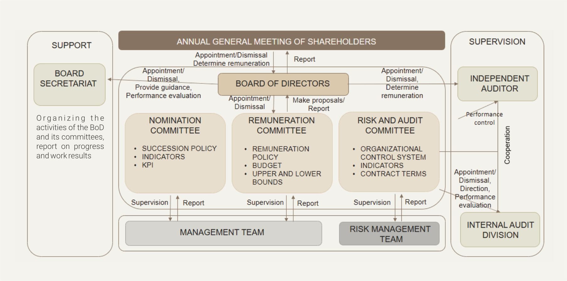 The BoD operates three committees: the Nomination Committee, the Remuneration Committee, and the Risk and Audit Committee. Each committee implements policies according to its function, monitors the activities of the company’s management team, provides assessments, and reports their findings to the BoD. The Risk and Audit Committee oversees the Internal Audit Division, which independently implements internal control across the company.