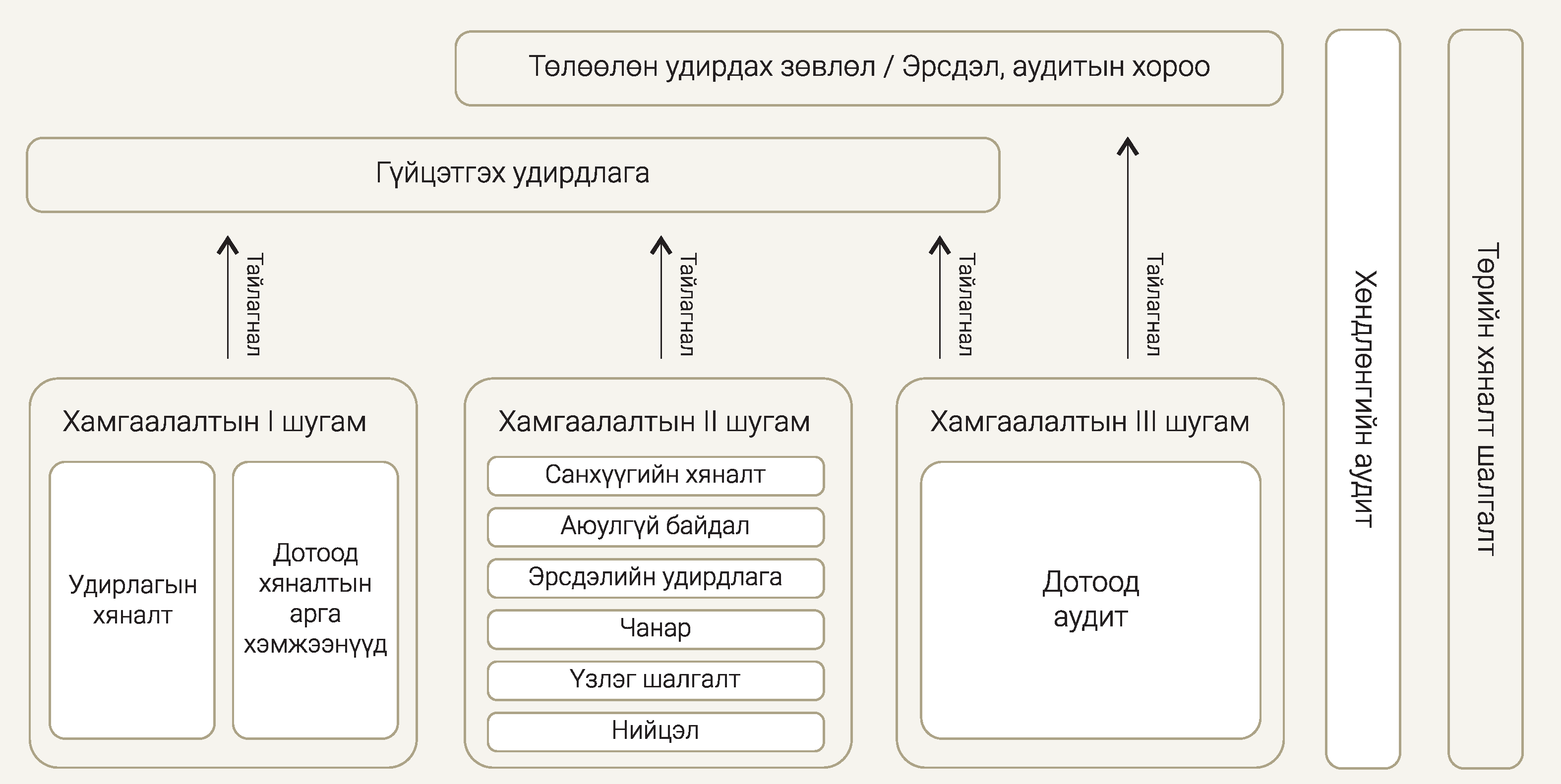 Манай компани дотоод хяналтын тогтолцоондоо “Хамгаалалтын гурван шугам” загварын дагуу зохион байгуулалтыг хийж, үйл ажиллагаагаа сайжруулан ажилладаг.